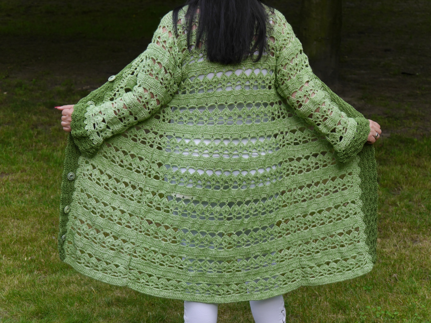 Rückansicht des gehäkelten Damenmantels „Lugano“ mit Raglan-Optik, nahtlos von oben gearbeitet