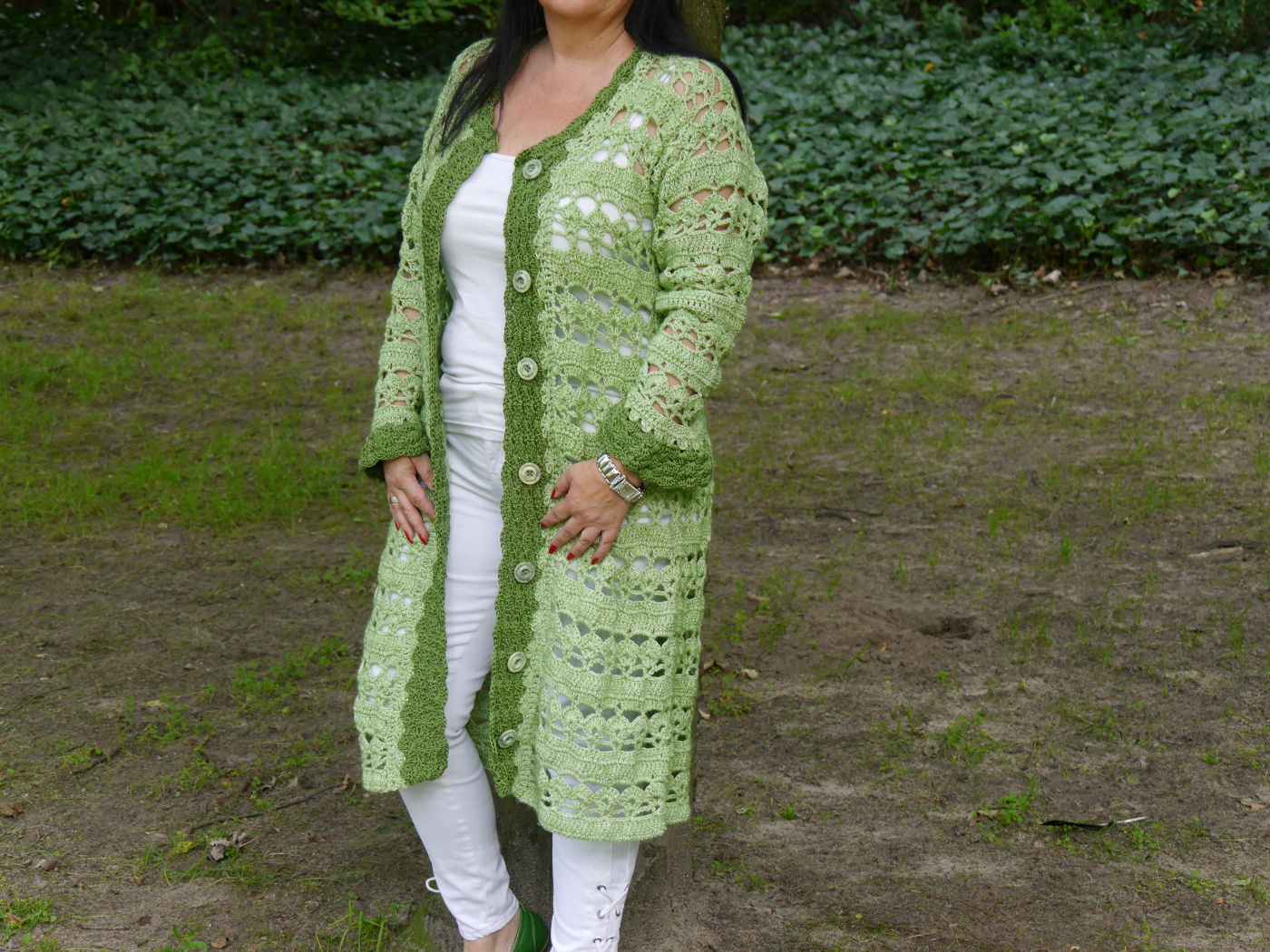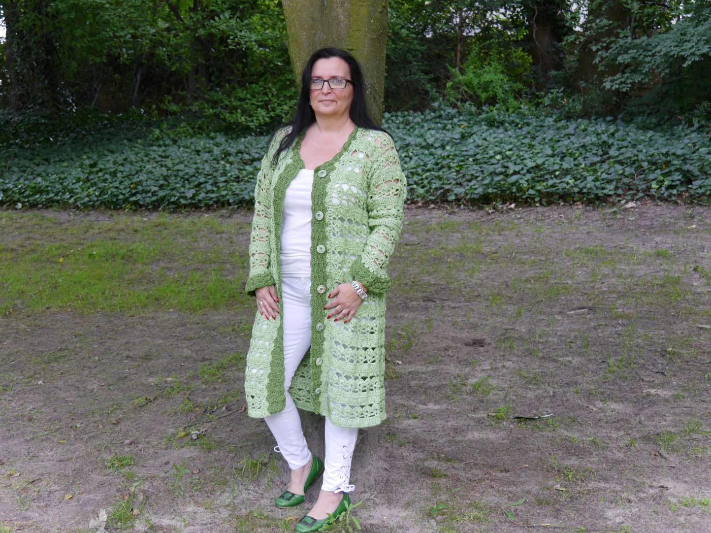 Preview: Gehäkelter Mantel „Lugano“ in RVO-Technik – Vorderansicht, getragen auf neutralem Hintergrund